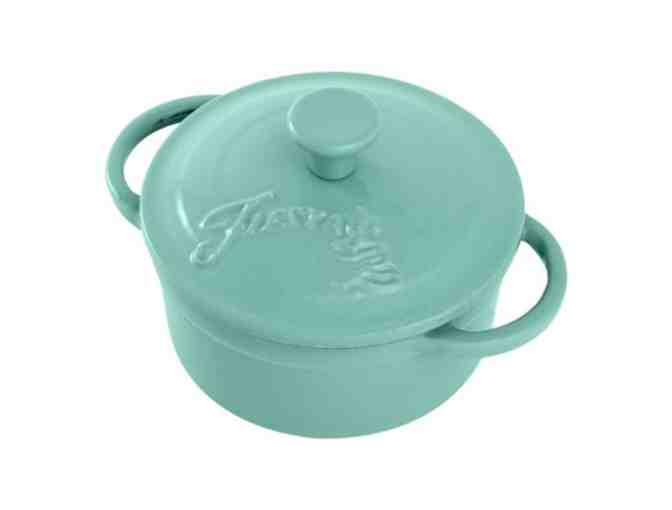 The Fiesta 0.35qt cast iron mini casserole adds a pop of color to any kitchen. Classic enameled cast iron with turquoise on the outside. Oven and broiler safe, perfect for dips and desserts!