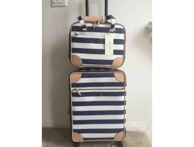 Kate Spade knows how to travel! This blue and white striped carry-on luggage case and and topper will get you where you want to go in style!