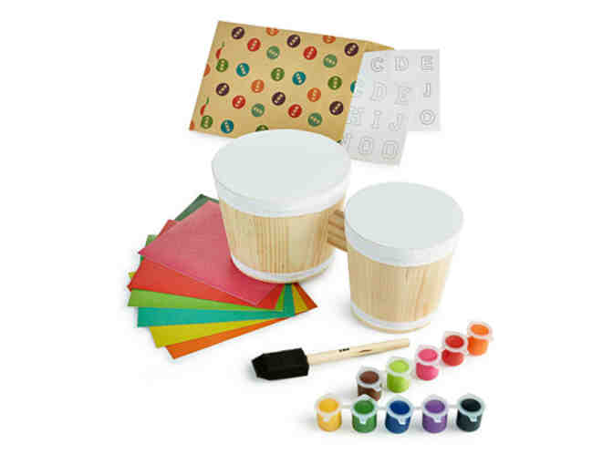 Let them make the music their own in every way with this bongo kit from Kid Made Modern. Includes everything needed to decorate a drum your way! For ages 9 and up. Includes raw wood bongo drum, glitter sticker sheets, stencils, sponge brush, acrylic paints. Approximate dimensions: 11.81" x 5.91" x 5.71".