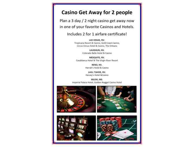 When you win this auction item you can choose between six different cities to go to: Vegas, Tahoe, Reno, Mesquite (NV), Laughlin (NV), and Biloxi (MS). The winning bidder receives three days/2 nights at a hotel, and a two-for-one airfare certificate.