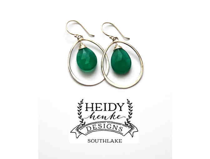 These Dragon green earrings are beautiful and were handmade by Southlake mom and silversmith Heidy Henke. Sterling silver with green onyx gemstones these beauties hang just over 1.5" from top of ear wire.