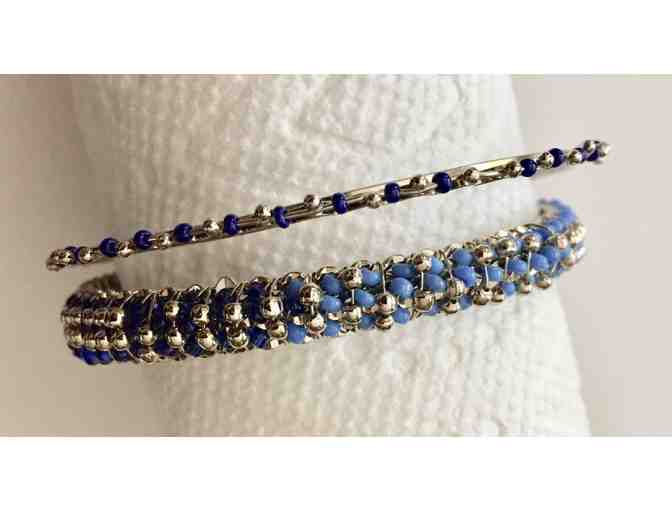 Pretty set of two silver-tone bracelets set with blue Stones. One has single row deep blue beads set between silver-tone bead. One has three rows of blue beads in 3 shades intertwined with silver-tone beads. Both are unique design and in great condition. Fits average wrist. Comes in gift box.