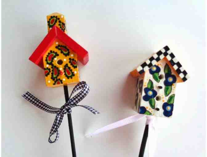 2 Hand-Painted Wooden Birdhouse Plant Stakes -- New