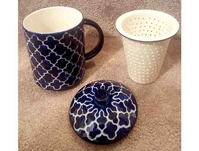 Inspired by the beautiful tile work in exotic cities from Marrakesh to Istanbul,this generous stoneware infuser mug will transport you to faraway lands as you sip your tea. The 14 oz. mug comes with a large infuser and lid.