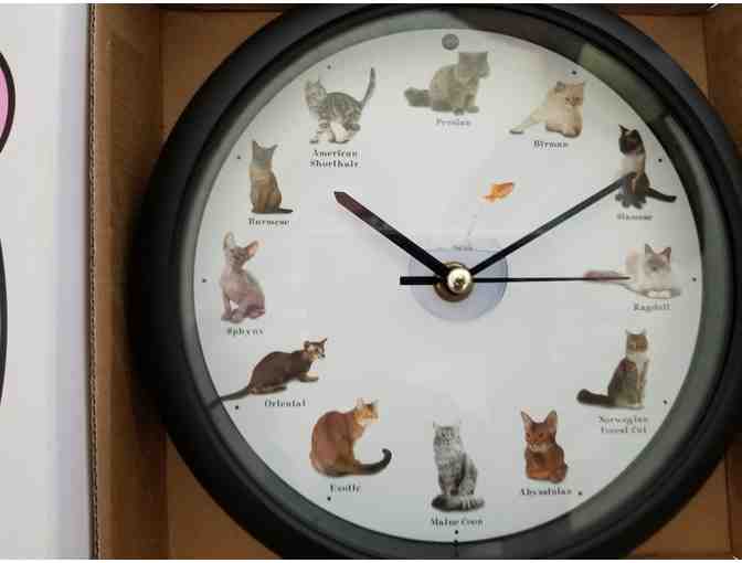 New in box. Features a different cat on each hour. Light sensor deactivates sounds when room is dark. 8"