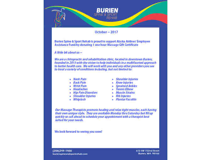 Burien Spine & Sport Rehab - 1 One Hour Massage #1