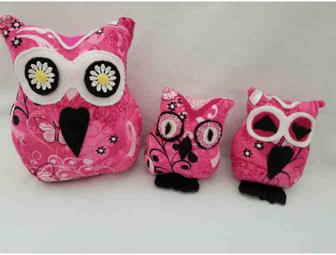 Beautifully crafted and coordinated by Yvonne Campbell are these three decorative owl pillows, a yearling and babies. Mama, yearling and babies. Mama measures aprox 11" x 8" and yearling is 7" x 5.5" and baby is 4.5"x 3.5". These are keepers for the owl aficionados!https!