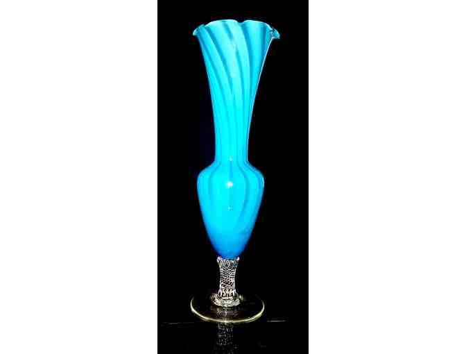 Fluted blue glass stem vase, 8.5" x 2.75".