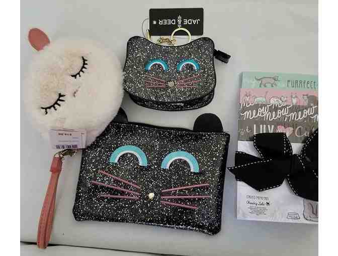 8" x 6" purse with kitty face and ears, zippered. Soft furry wristlet, also zippered. Coin purse 5" x 4" zippered.