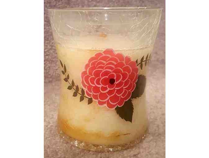 9 oz candle is 4.5" high and 3.5" wide. Raspberry Rose scent. Smells delicious!