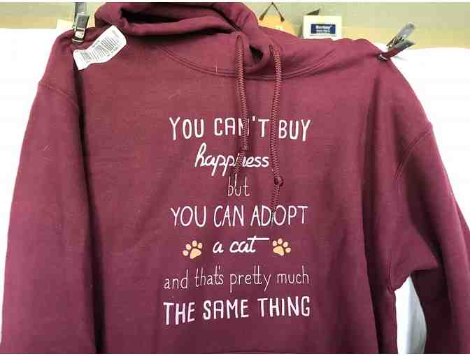 Pullover hoodie, nice and thick. New. Wine colored. Across front it says, "You Can't Buy Happiness, but You Can Adopt a Cat and That's Pretty Much the Same Thing"