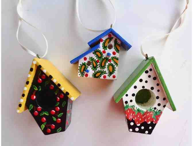 Wonderful hand-painted wooden birdhouse ornaments with white ribbon for hanging. Measures vary 2" & 3". Fun, unique gift!