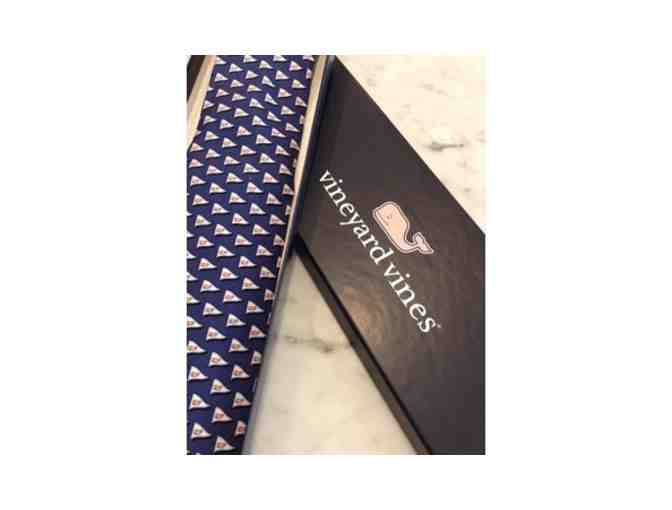 A classic and handsome Vineyard Vines 100% silk navy blue tie adorned with pink whales on white flags.