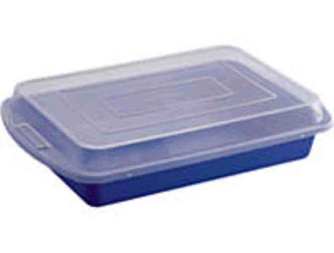 9" x 13" covered hybrid ceramic cake pan by Silverstone, in ocean blue.