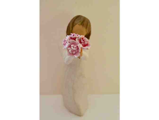 Willow Tree ® figurine Thank you with pink flower bouquet extended. Has “So appreciative of all you do!” Made of painted Resin. Designed by Susan Lordi. Measures 5" tall. In original wrapping and box.