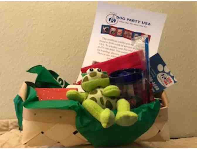$100 gift certificate that can be used for boarding, daycare or grooming plus a gift basket full of treats and gifts for you and your canine friend.