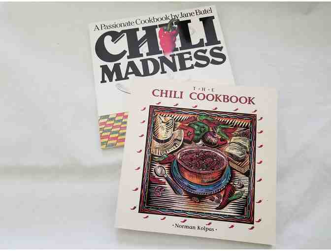 Pair of pre-owned soft cover cookbooks in very good condition focusing on the fine art of CHILI. Donated from the experienced kitchen of Tom and Jan Jerrells.