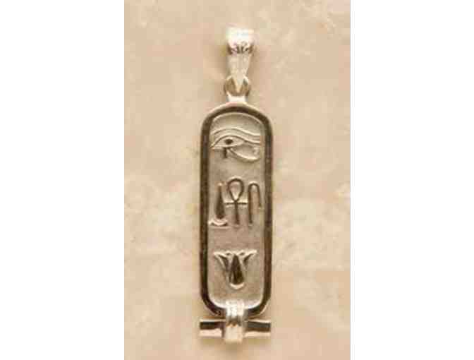 Made in the heart of the old city in Cairo, Egypt. The Eye of Horus and the Lotus Flower flank three symbols in the middle, the ancient hieroglyphs for Health, Life & Happiness. 16" chain included.