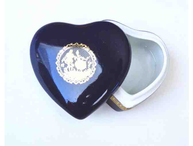 Delicate ceramic trinket box. Shows a couple in gold dancing the minuet on lace. Measures 2.5" x 2.5".