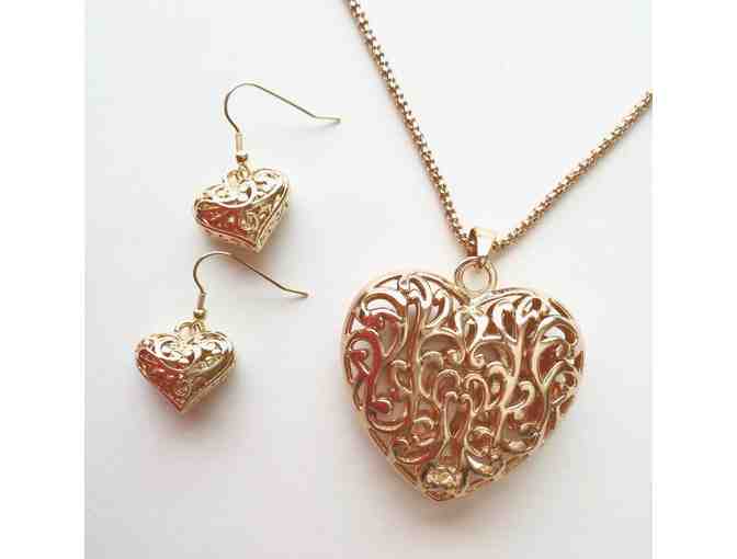 Gold-Tone Filigree Heart Necklace & Earrings Set -- New