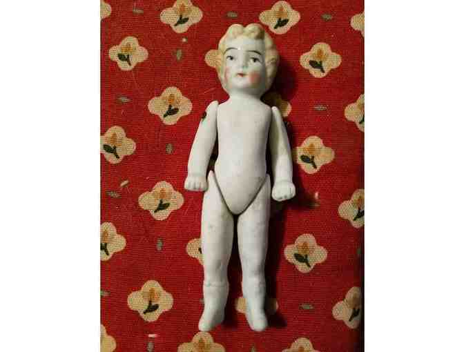 Antique porcelain china doll with moveable limbs held together with wire. Approx. 4.25 inches in length. Good condition with curly blond hair, blue eyes and rosy cheeks. Details at feet and ankles suggest boots.