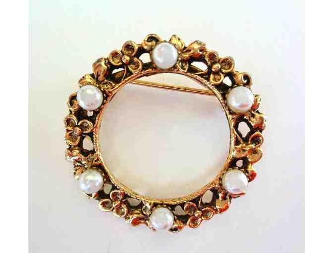 Pretty circle pin with ring of 6 pearls set on a gold-tone base of flowers. Measure 1.25" diameter.