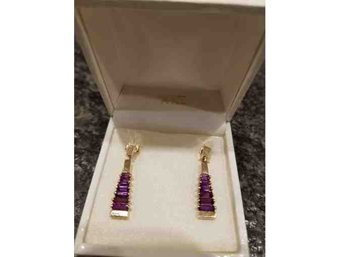 These are gorgeous! Beautiful setting with six graduated amethysts in each earring. Post backs. Measures aprox 1" long and 1/4" at bottom.