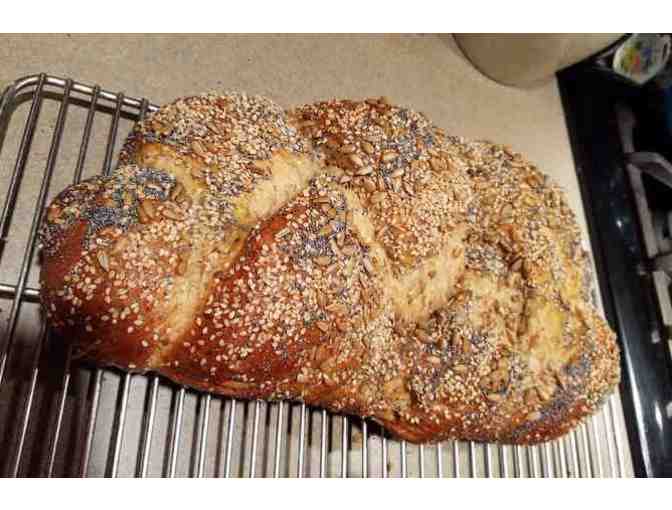 A big loaf of rich, homemade challah for your holiday table. The one pictured has 5 different seeds in it, but the bread can be altered to your taste.