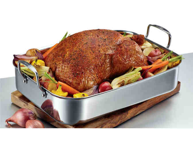 Roast mouthwatering chicken, beef, pork and more in the Anolon Tri-Ply Clad Stainless Steel 17-Inch by 12-1/2-Inch Large Rectangular Roaster with Nonstick Rack that cleans up easily in the dishwasher.