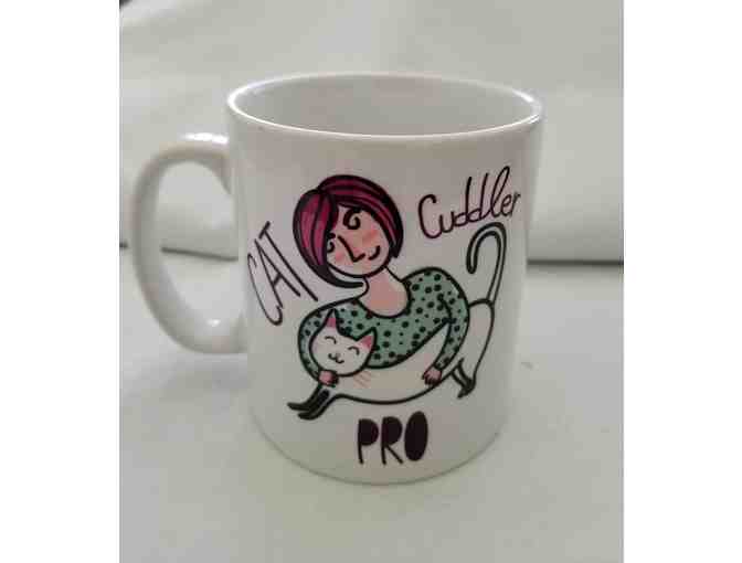 Cup says "Cat Cuddler Pro" and is approx 4" tall