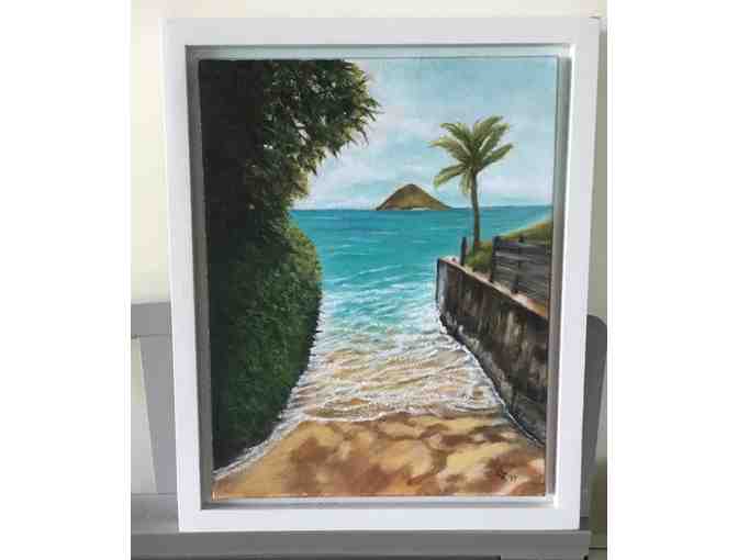 Original acrylic painting, "Lanikai Beach Public Access" by Naturescape and Still Life Artist Liz Au.  11" x 14" framed acrylic painting on canvas.
