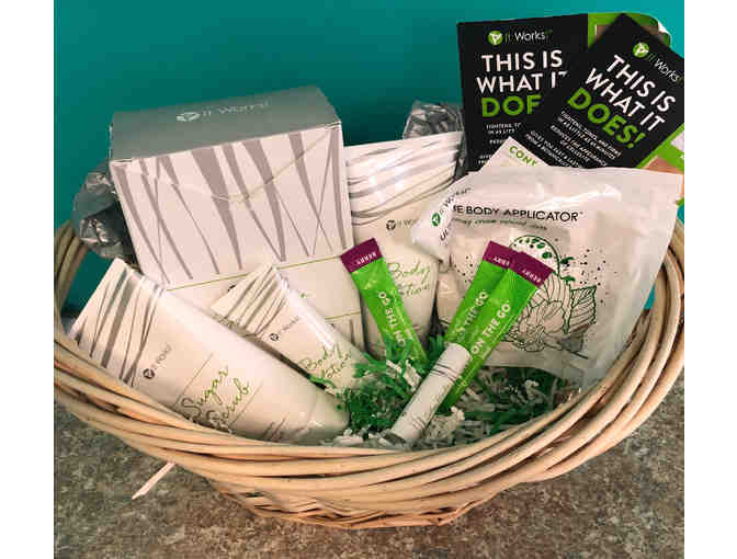 A gift set basket filled with Peppermint Body Lotion (2oz & 6oz), Ultimate Body Wrap Applicator, 6oz Peppermint Sugar Scrub, and Peppermint Lip Balm.
