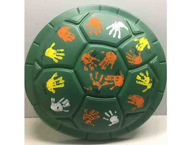 Turtle sand box filled with Crayola markers, paints, chalks, crayons, stencils, and brushes. The top of the sand box is decorated with the kids' hand prints.