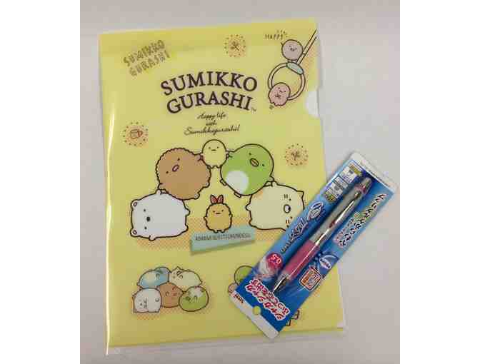 Up for bid is a plastic sleeve to hold papers, decorated with characters from Sumikko Gurashi (Tonkatsu, Shirokumma, Peng, etc.) + a Mitsubishi Shaker Mechanical Pencil with pink gel grip.
