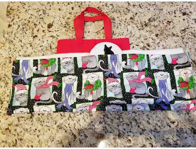 Ok, folks this is adorable! Handcrafted by Valerie Sharma this generous 24" x 24" double sided kitty blanket is tucked inside a handcrafted 9"x 10" double handled bag. Also includes toys and even a catnip toy with the Shadow Cats logo. So cute! Lots of love goes into these!