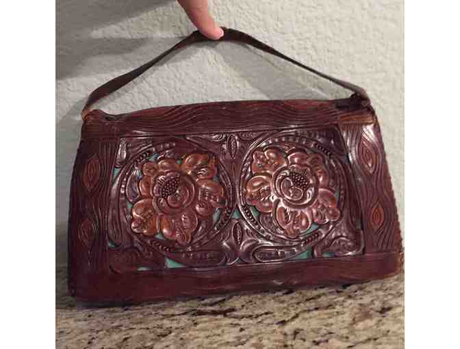 Custom Handmade Leather purse, 12" width, 7" height beautiful leather carving over light green background condition: used