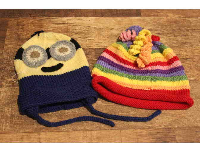 Keep the kids' heads toasty and warm with these 2 hand knitted hats! The Minion hat is baby size and the multicolor with twirl pieces is child size. Lovingly made by a member of St. Paul Lutheran Church.
