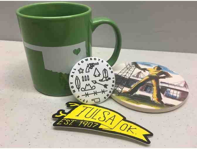Oklahoma heart mug in apple green, Tulsa Driller coaster, Tulsa pennant sticker, and Cowboys and Indians button