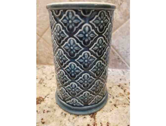 Blue ceramic vase. New. 8" tall and 4.5" across. Patterned.