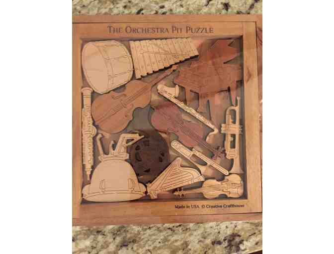 Wooden Orchestra Pit Instrument Framed puzzle, 7.5"x7.5" square condition: new, shrink wrapped