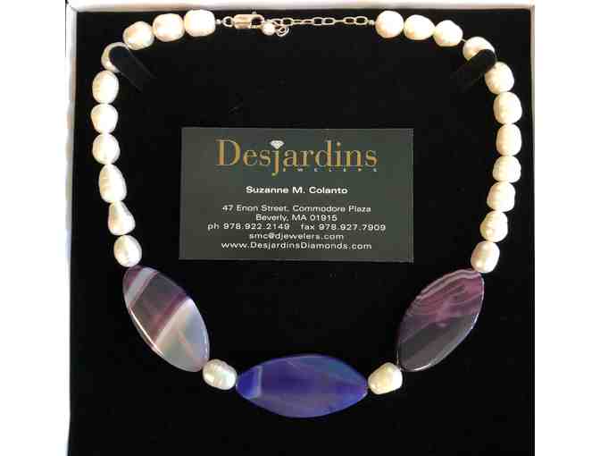 You're bidding on a beautiful fresh water pearl necklace with three stunning "amethyst lace" stones. The necklace has an adjustable clasp and can be worn at 18"- 20" in length. Gorgeous!