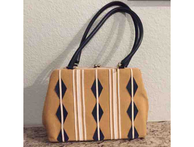 Vintage Rada Borse beige fabric purse with leather trim and handles, made in italy, brass clasp, 10.5" width, 7.5" height condition: very gently used