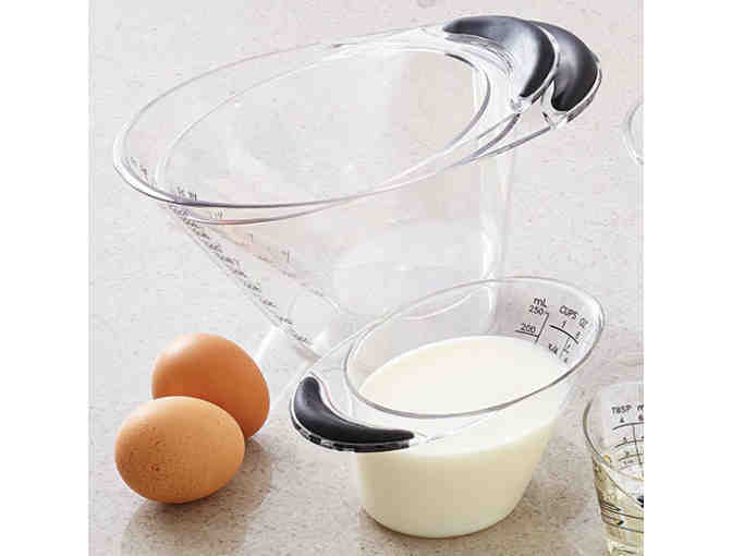 This efficient and innovative design is ideal for measuring liquids. Durable clear plastic makes it easy to read standard and metric measures from above. Flared rims prevent drips when pouring liquids. Includes standard and metric measures. Set of 1-, 2- and 4-cup measures nest for compact storage.