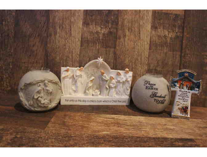 This bundle includes a lovely ceramic cross, two Peae on Earth votives, and a nativity figure with "For unto us this day a child is born which is Christ the Lord." All three items are the perfect addition to any home during the Christmas season!