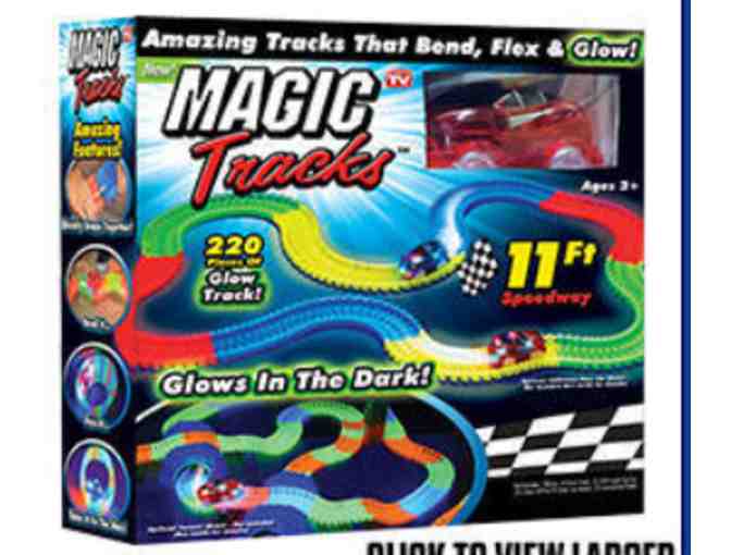 Introducing Magic Tracks the amazing racetrack that can bend, flex and glow! You can change the design of your track into any pattern, the magic is serpentine technology. Just snap any track pieces together and in seconds you’ve got a customized speedway! The neon tracks glow in the dark! Each race car has 5 built-in LED lights that glow as they speed around the track. Turn off the lights and Wow! It Glows Like Magic.
