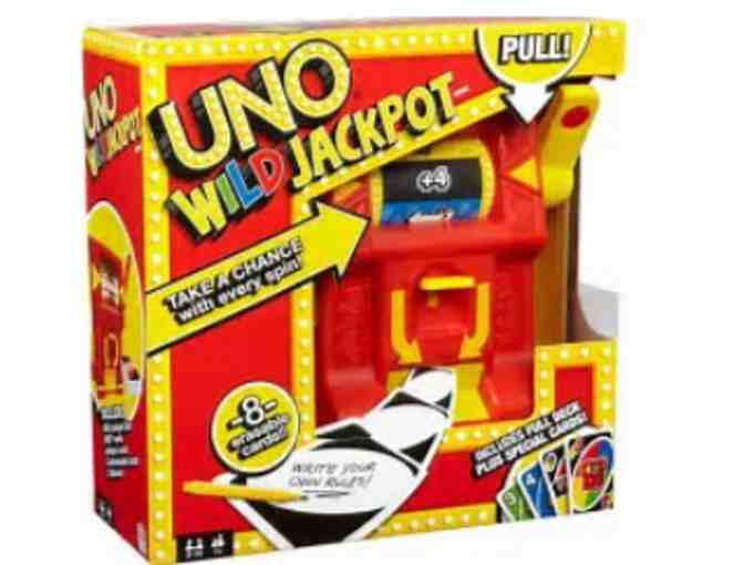 UNO Wild Jackpot is a spin on traditional UNO that incorporates a slot machine-style device and re-writable custom rules cards.