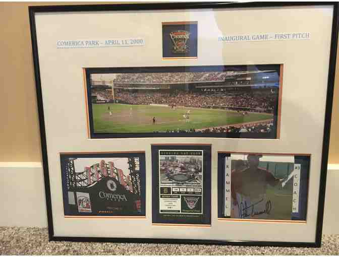 Inaugural Game at Comerica Park Plaque with photos, ticket, and signed Alan Trammell photo