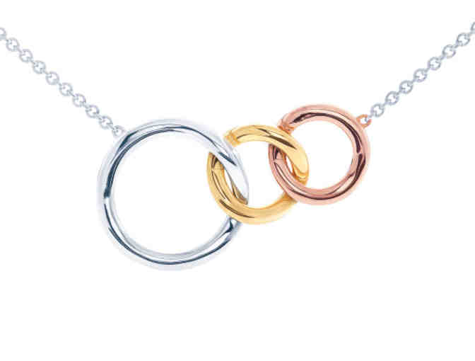 This Miracle Links™ necklace represents the unbreakable bond between a mother and her child. A sterling silver circle links together with a smaller 10K yellow gold circle and 10K rose gold circle. The design suspends from a cable chain that adjusts from 17 to 19 inches and is secured with a lobster clasp. Add a new link (sold separately) each time your family grows, and celebrate the miracle all over again. Necklace comes in a luxe purple box.
