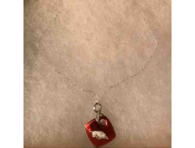 Lady's 18" sterling silver necklace chain with red enameled Razorback pendant.