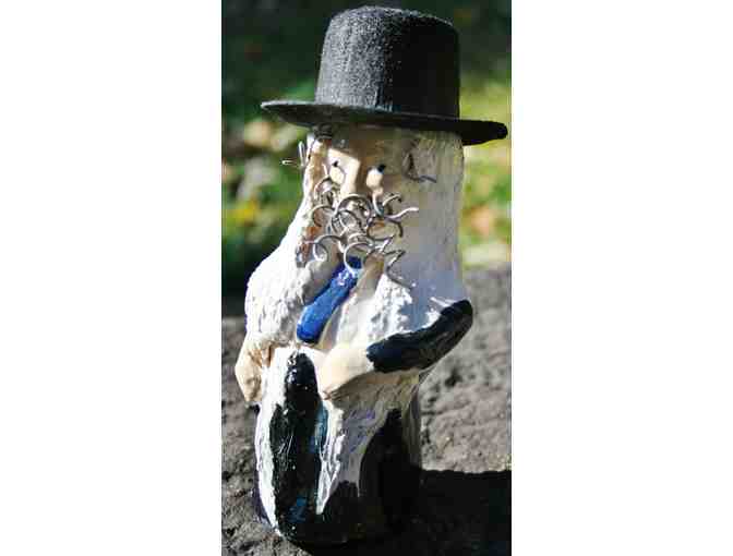 "The Rabbi", with tzitzit, talit, and a black hat, is made with special fabric in a two-step process. The wire is fired into the piece. The hat is removable - don't worry, he is wearing his yarmulke underneath!